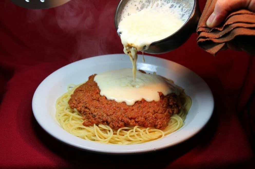 北海道の生クリームをふんだんに使った、熱あっつあつの濃厚チーズソースとミートソースのコクが超絶!ノックアウトです!デザート、サラダ、ミニピザのセットでお腹いっぱいお楽しみください。